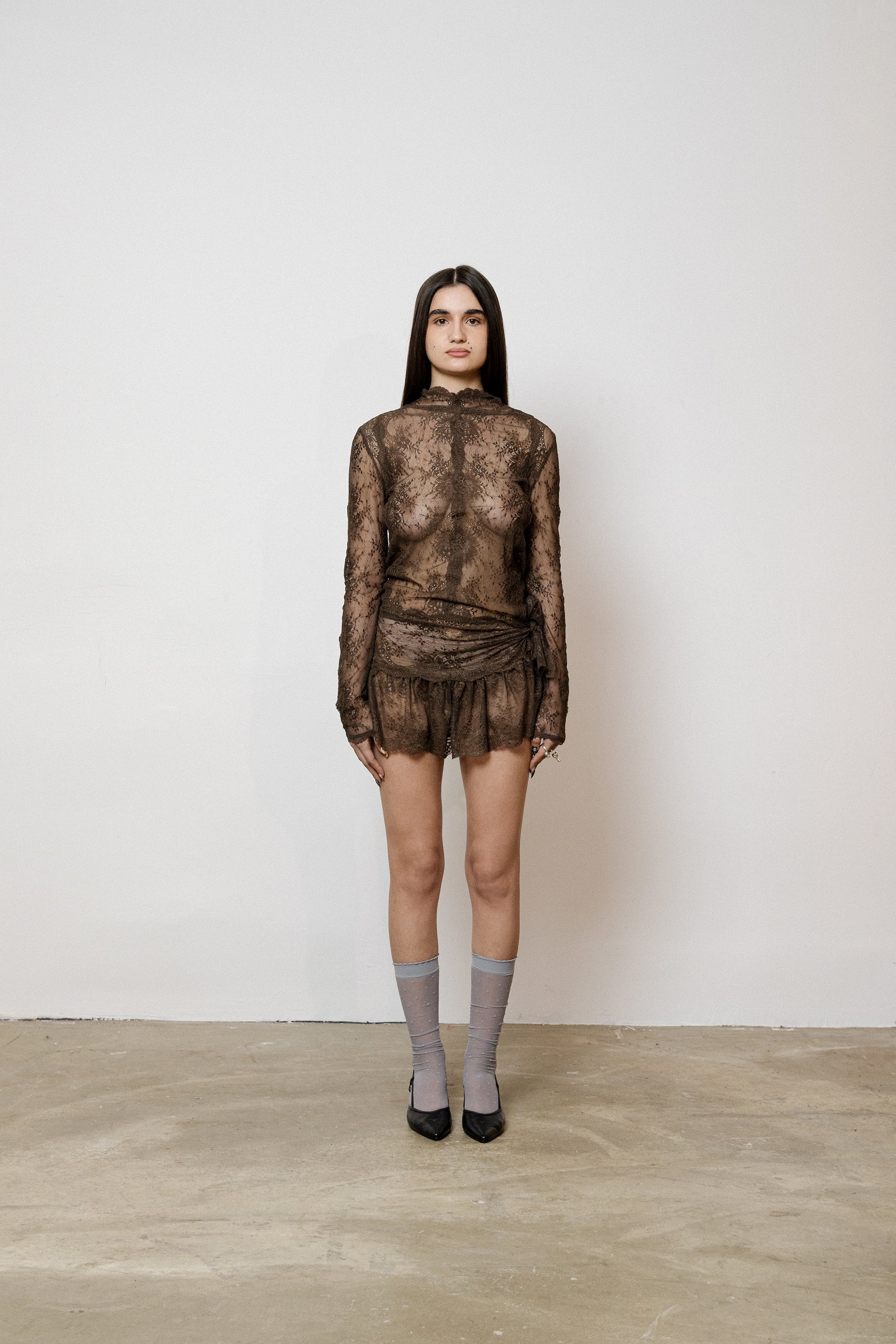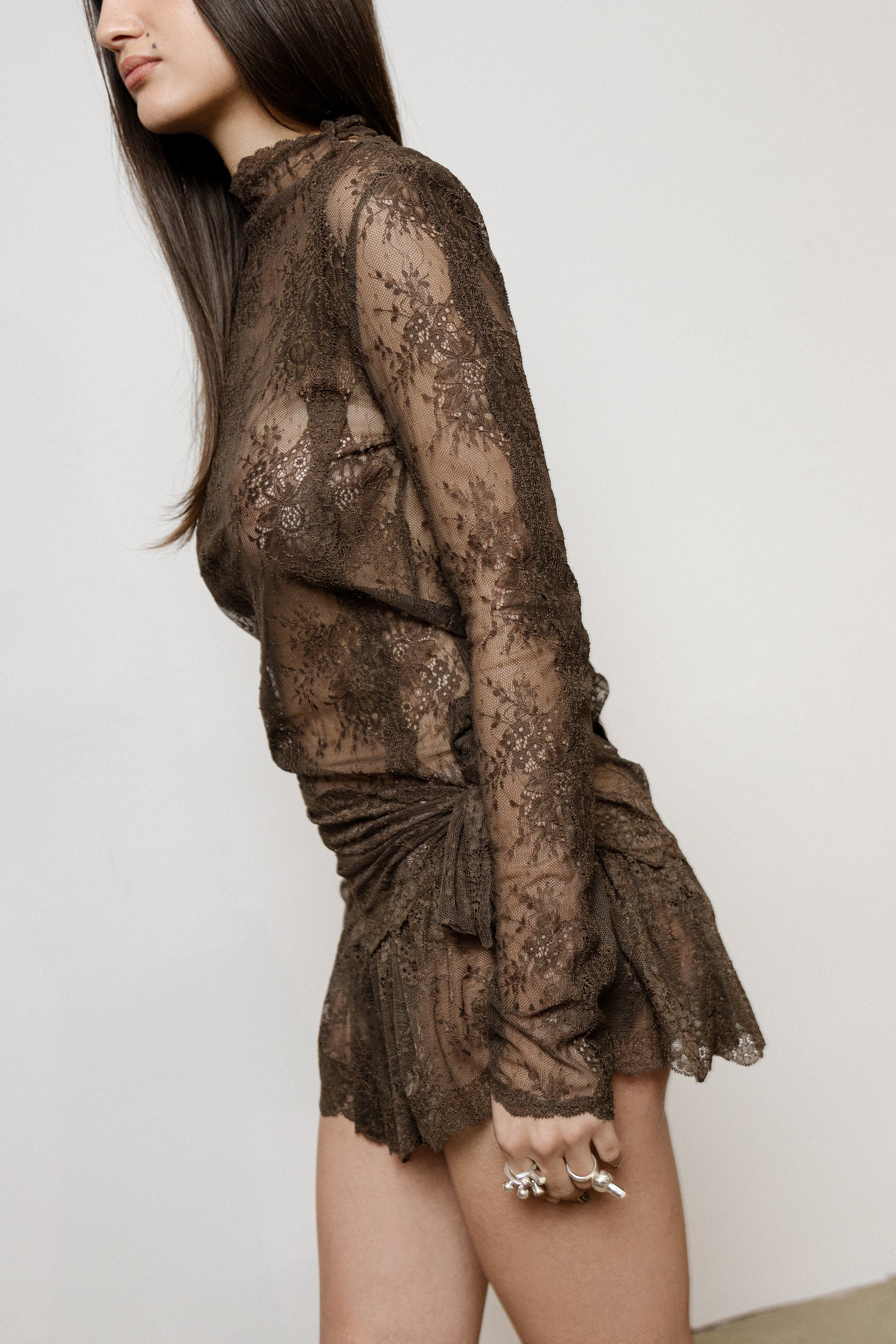 Patchwork long sleeve mini dress made with dead-stock haute couture lace from Rome. Opens at the neckline with a snap button and can be adjusted at the side of the mini ruffle skirt. Each piece is made to order and requires time and care to make in our Parisian atelier or by skilled artisans. Care: - Hand wash, max 30°C - Can be dry cleaned - No need to iron