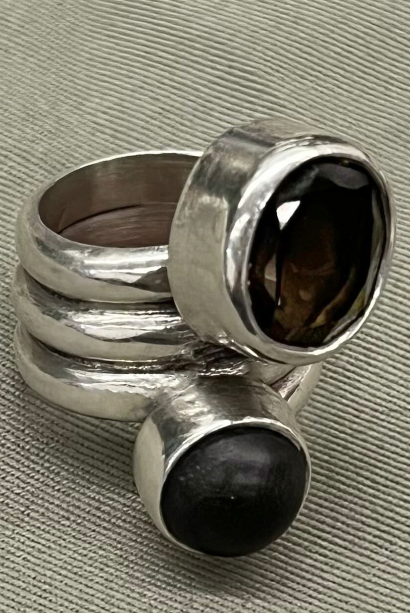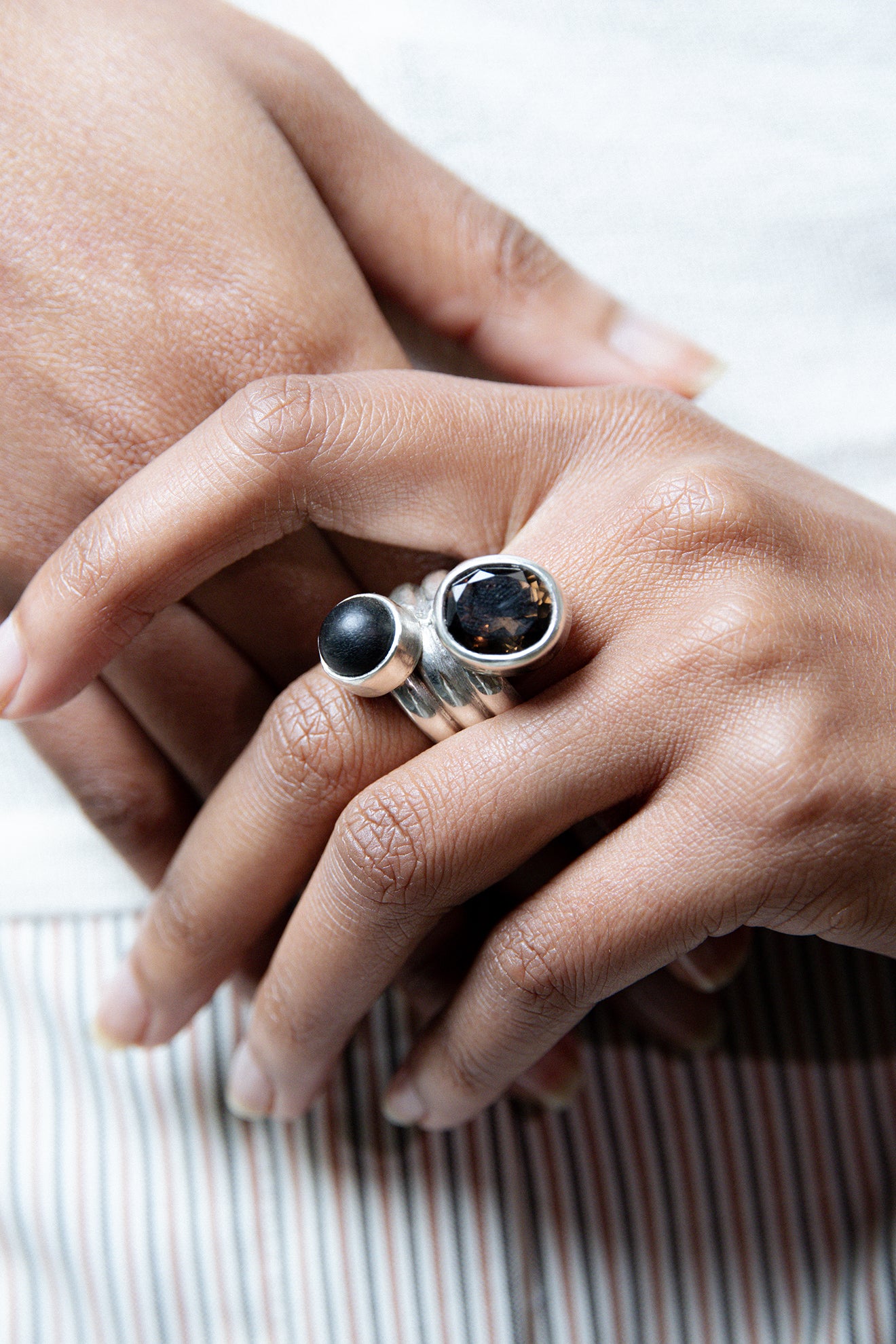 Ring in 925 silver formed by a spirally wrapped half-round wire, set with an oval smoky quartz and an ebony cabochon.