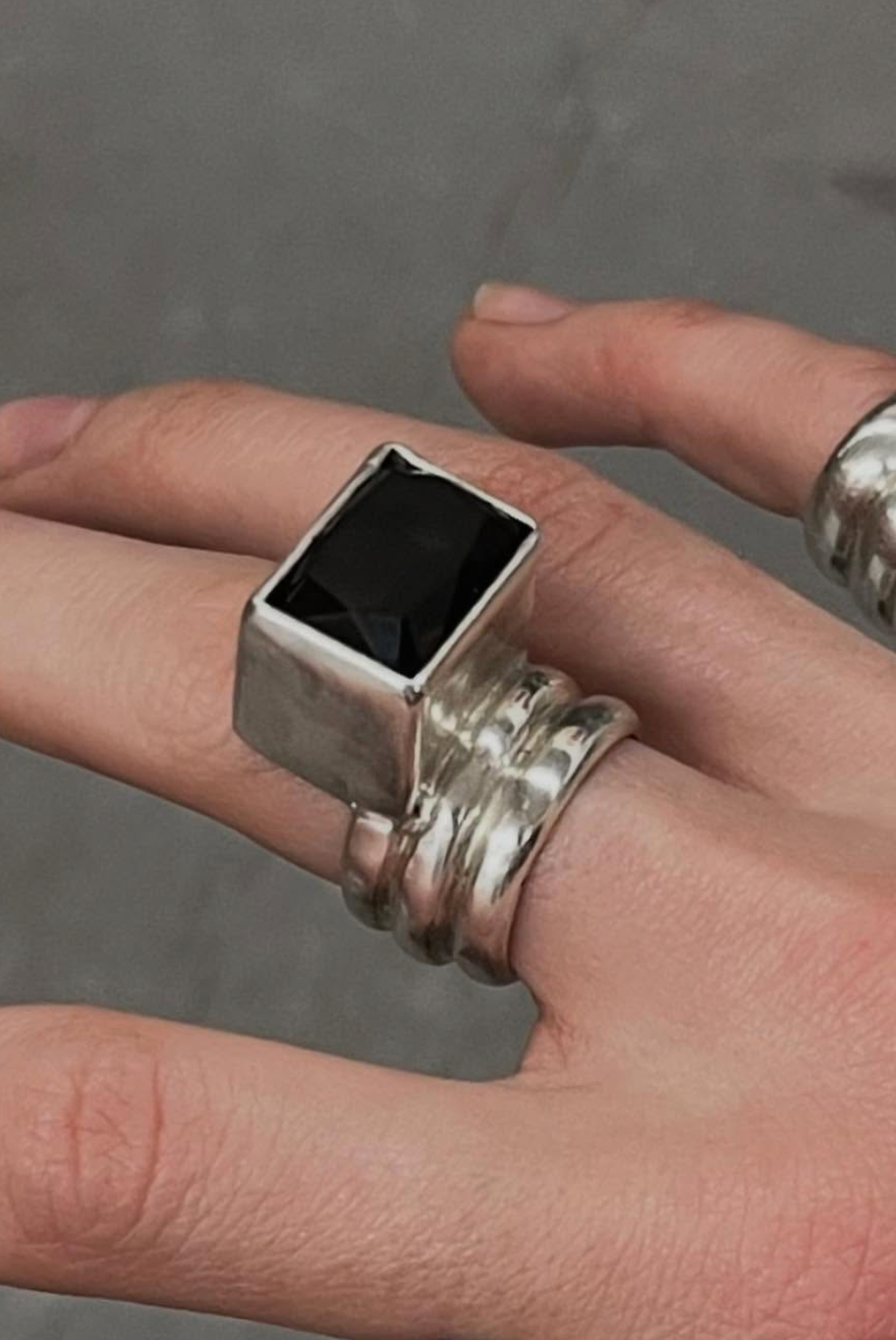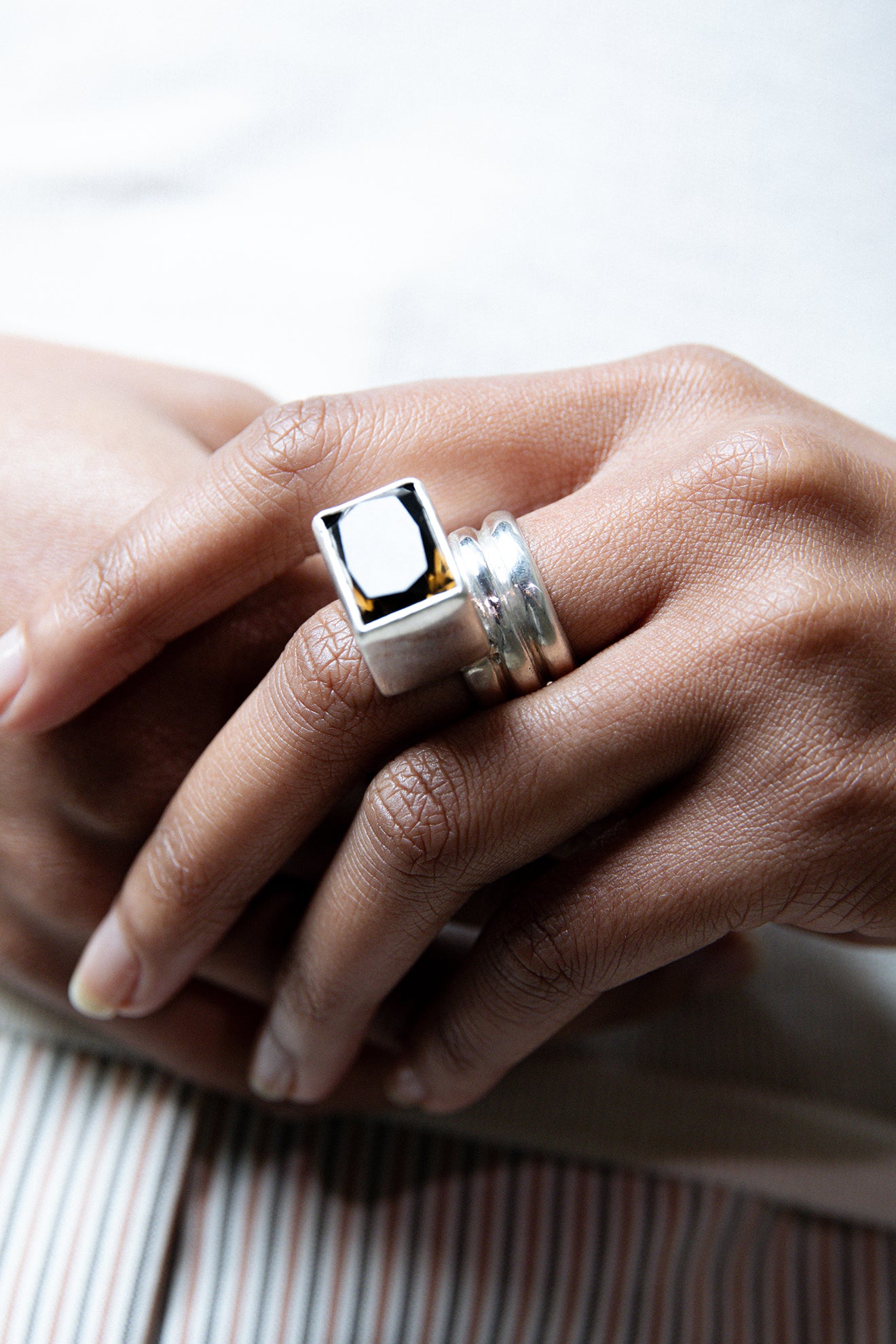 925 silver ring composed of three half-round wires, featuring a slightly off-centered smoky quartz in a hand-crafted bezel setting.