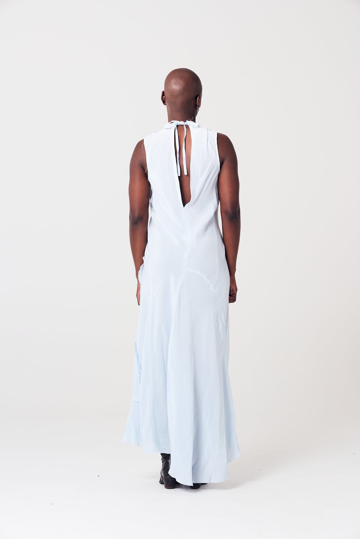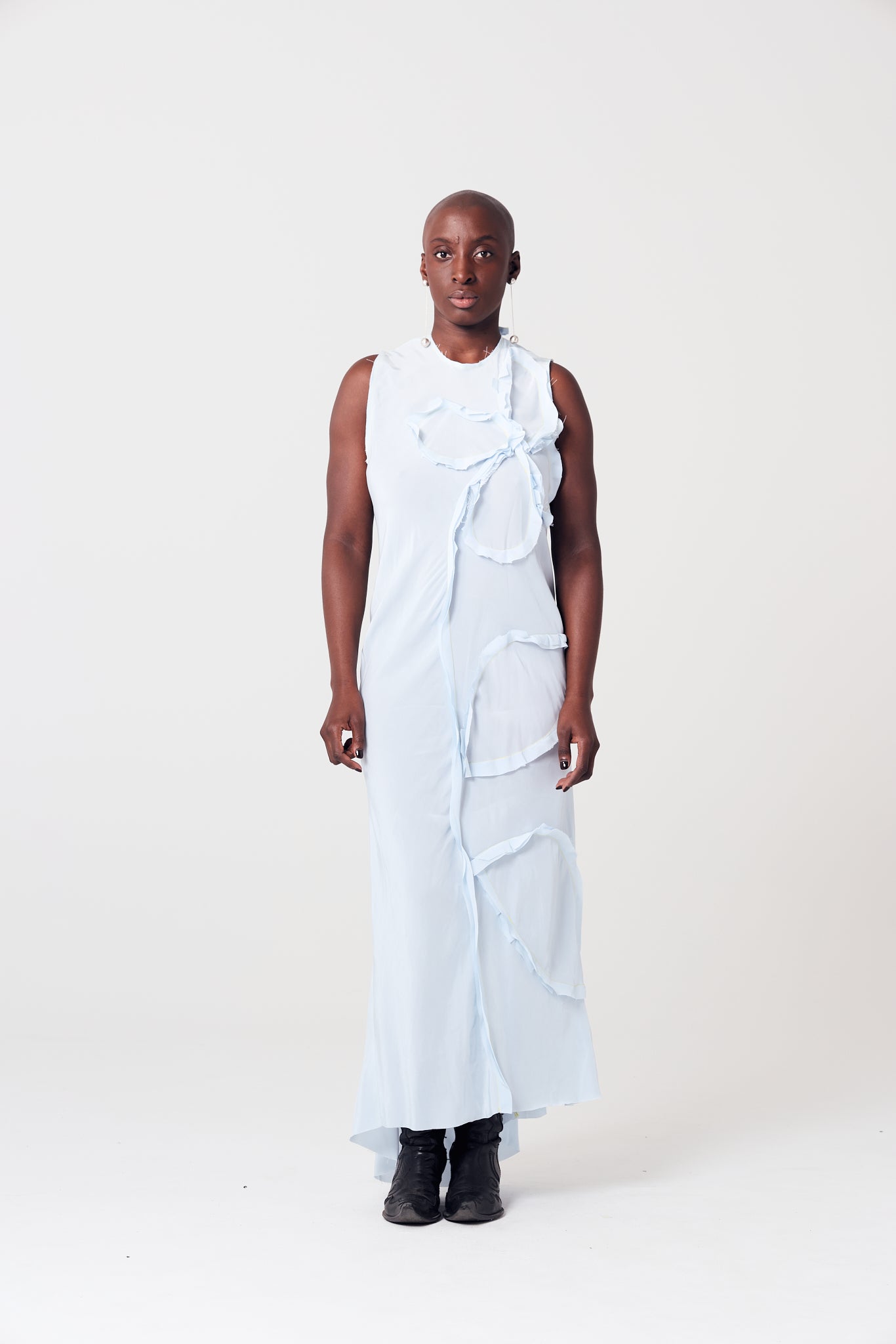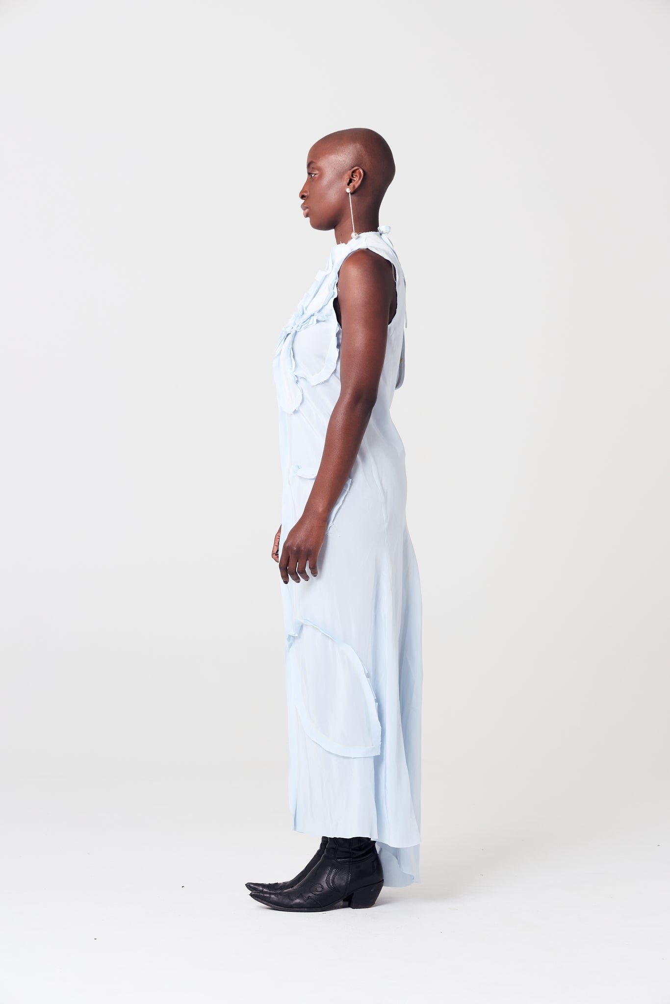 The dress features a unique flower-inspired design, created through visible panels and stitching, adding texture and elegance to the silhouette.
