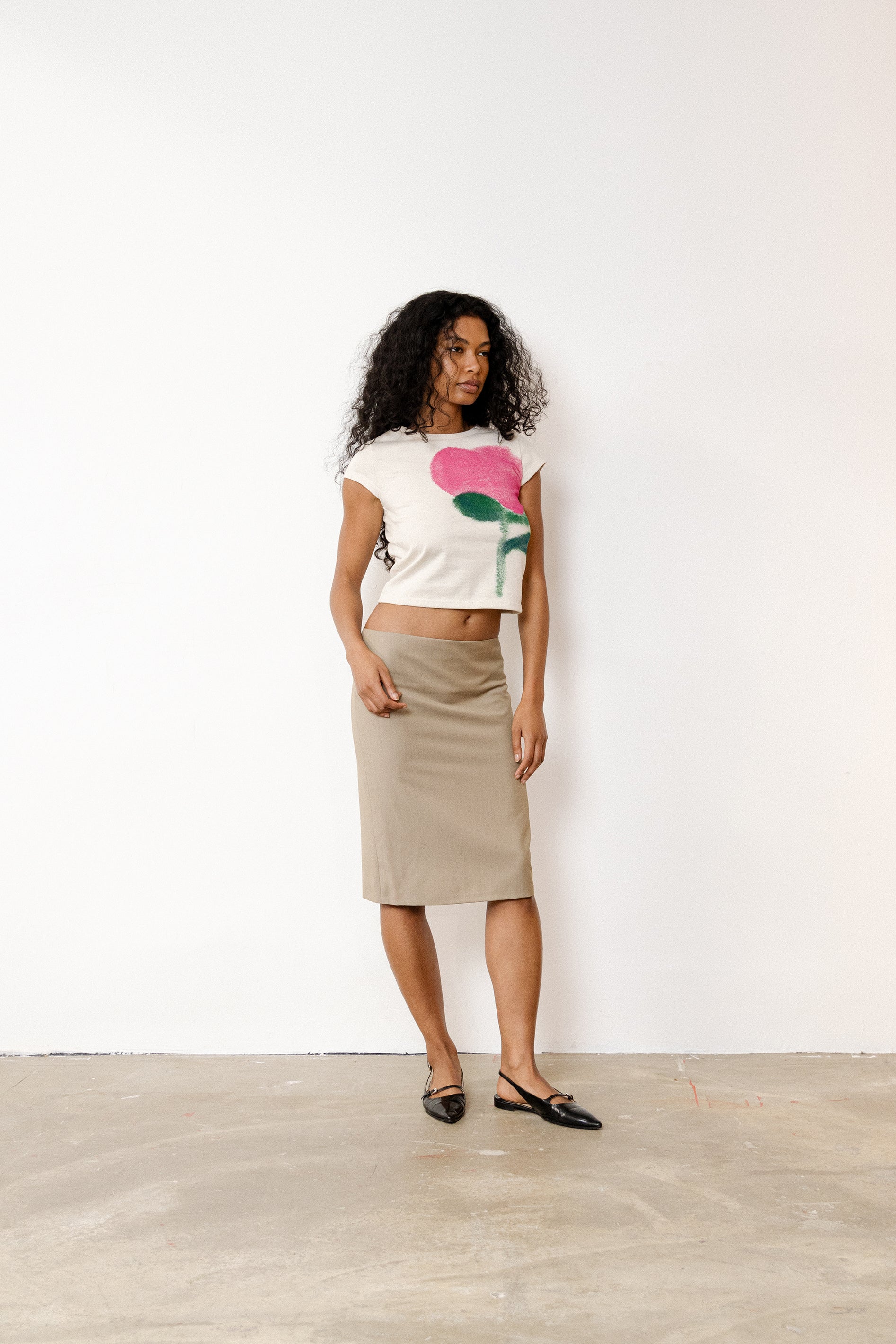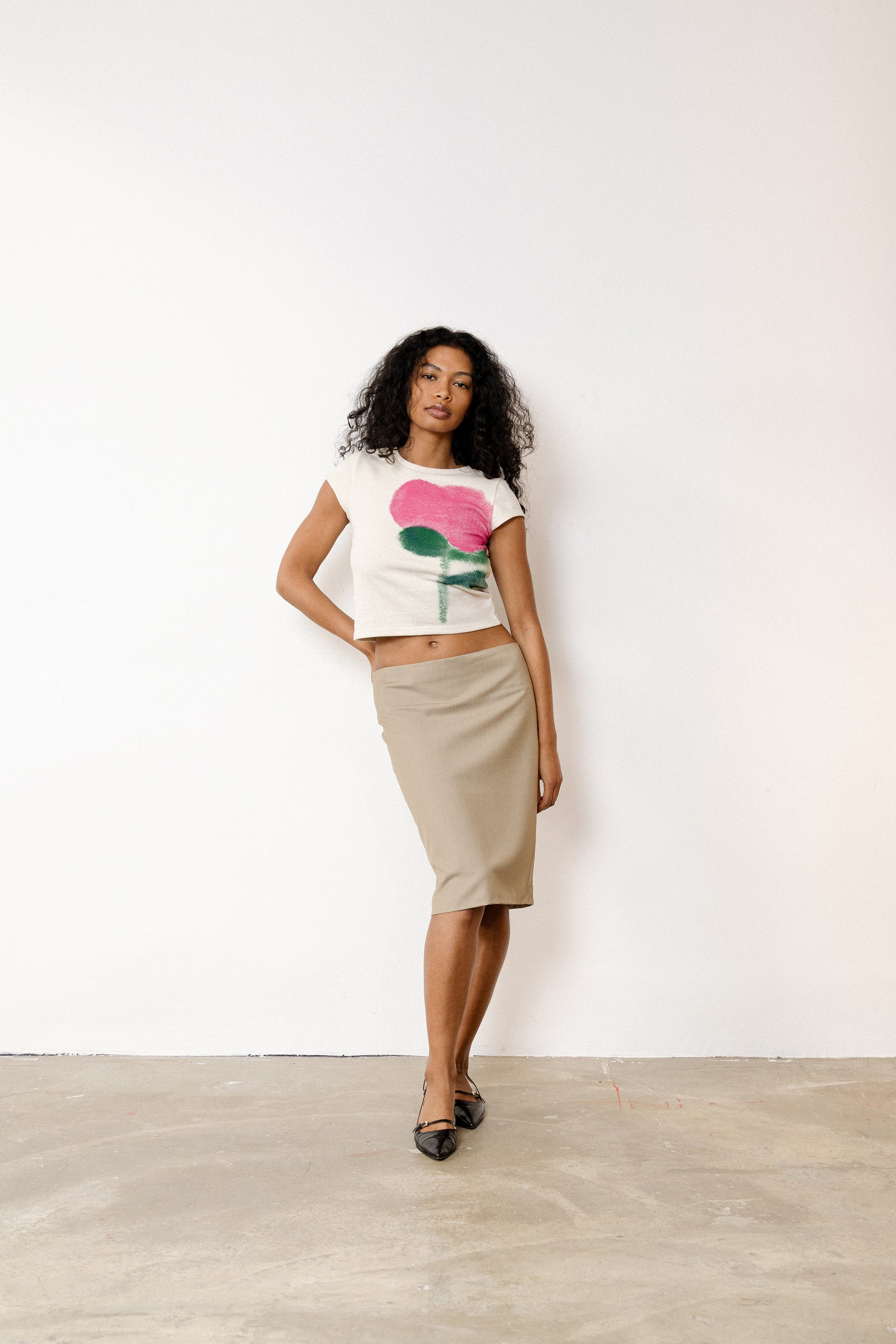 The Blurry Bloom Top features a soft floral motif, screen-printed onto a luxurious jersey fabric sourced from the dormant stock of a French luxury house. The floral print, with its diffused lines and hand-painted inspiration, evokes petals seen through a morning haze, a wearable fragment of a dream. Each piece is made in France with care, using responsible materials and artisanal printing techniques.