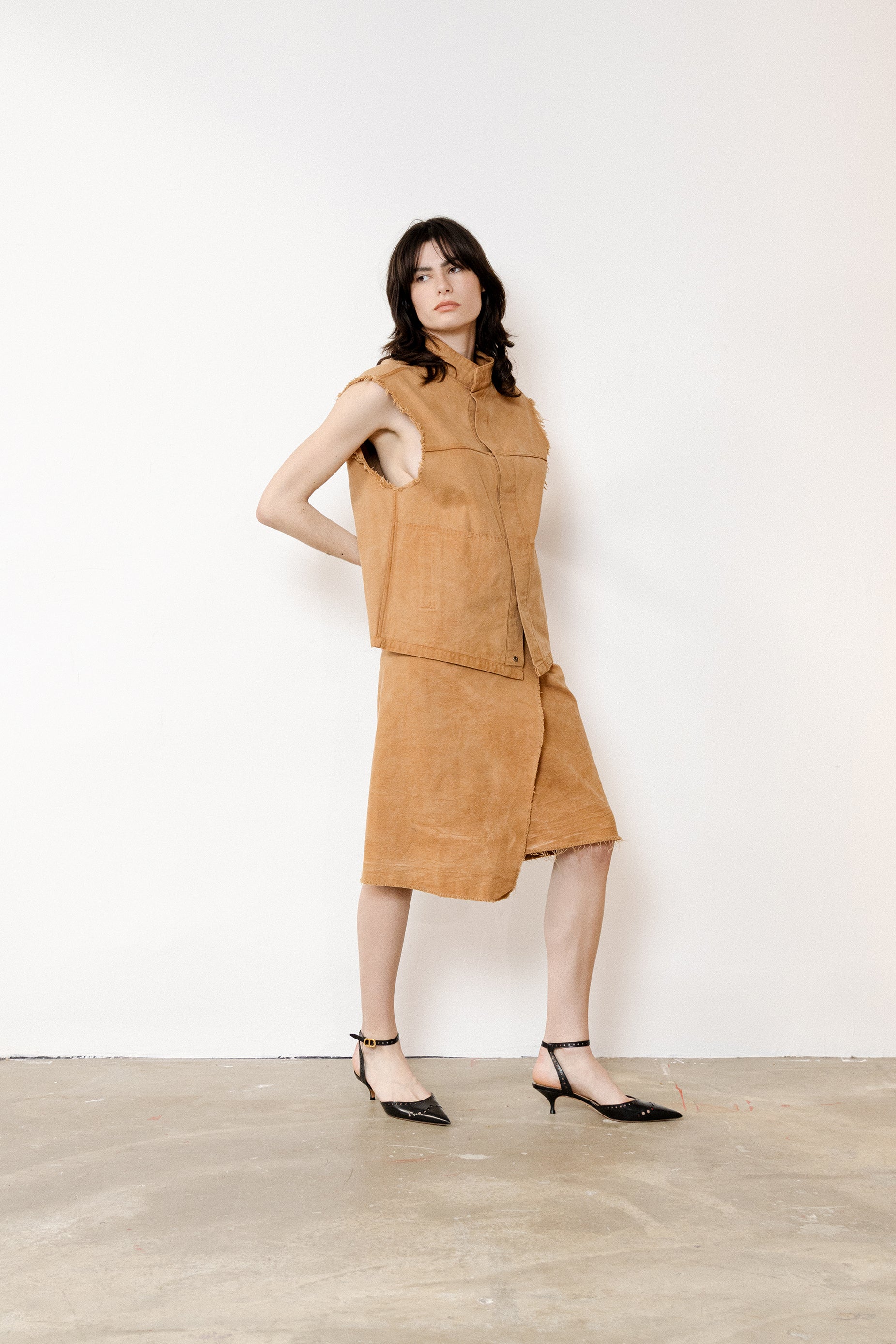 Snap button closure. Raw edge raglan pocket and large interior pocket on each side.