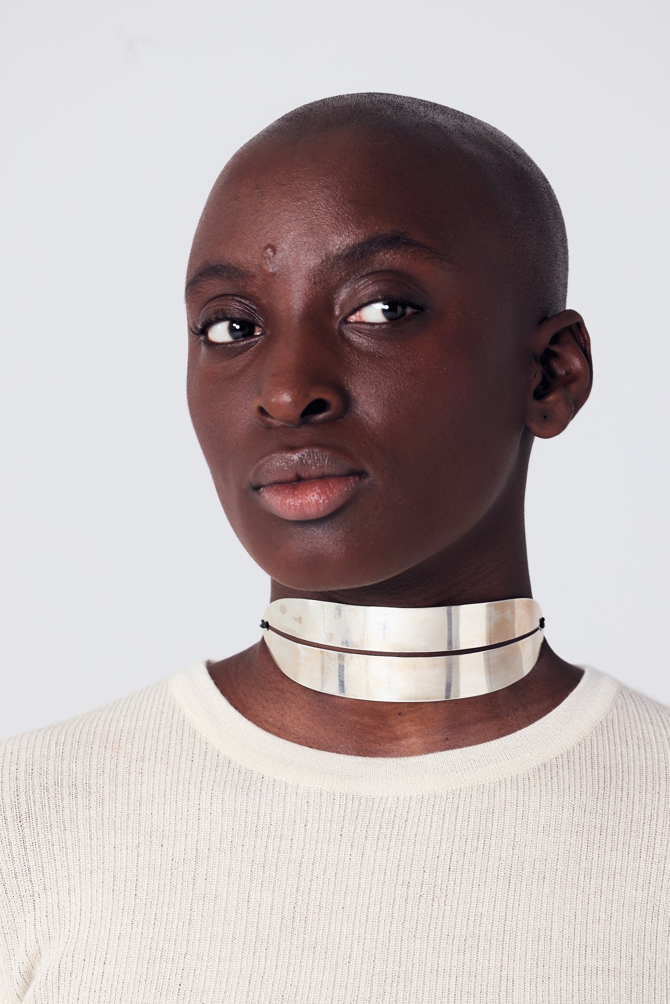 The Blade choker forms a protective shield around your neck, crafted in 92.5 sterling silver.