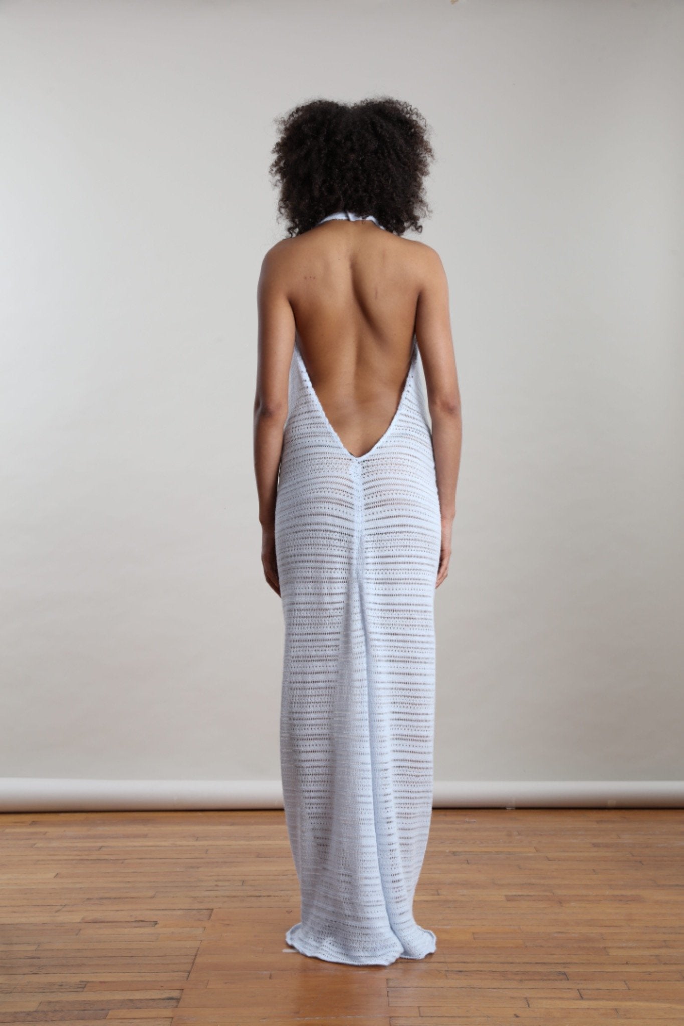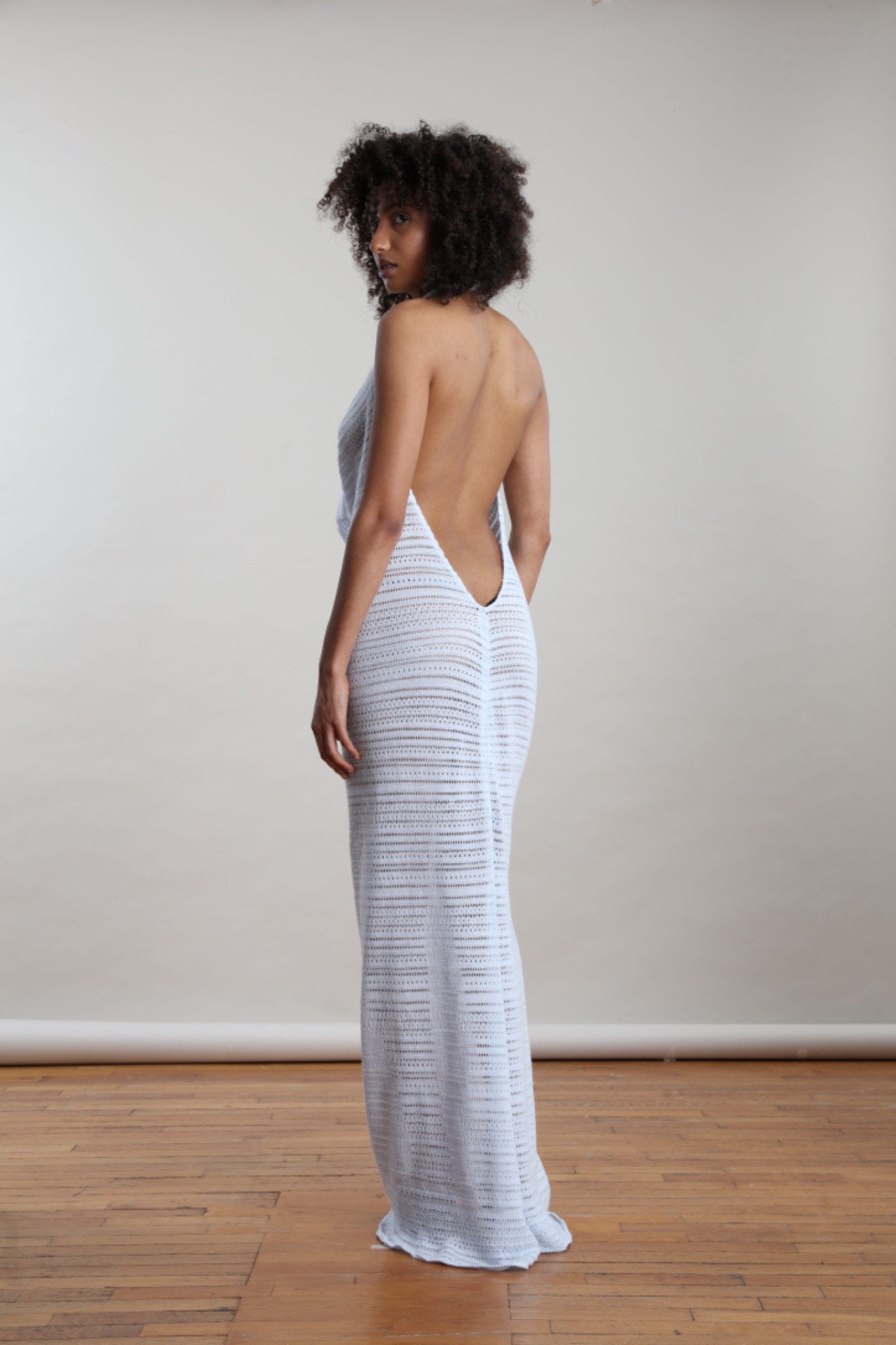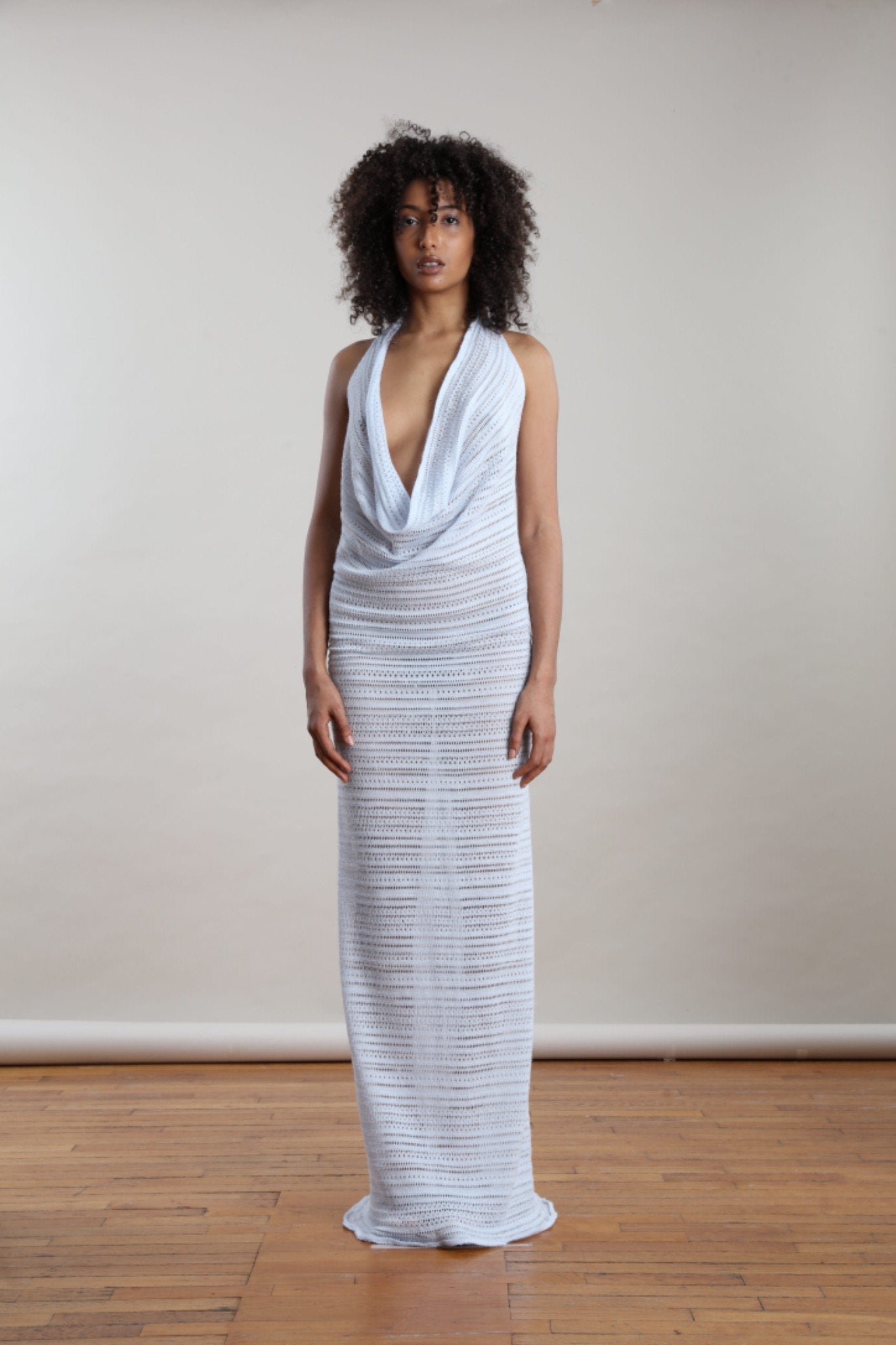 Extra-long dress with draped plunging neckline, scooped bare back and slit at bottom.