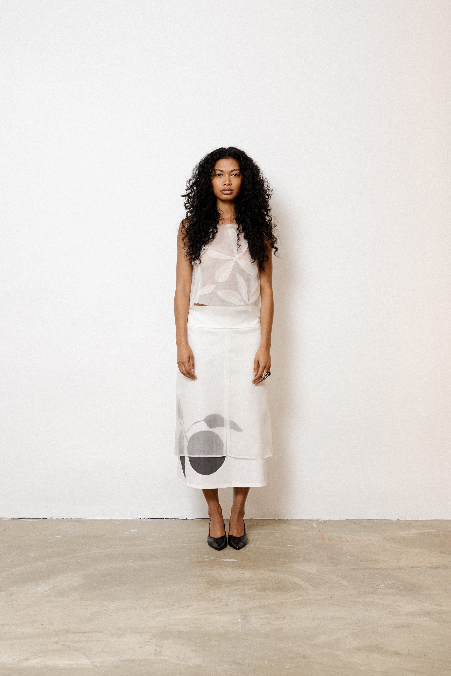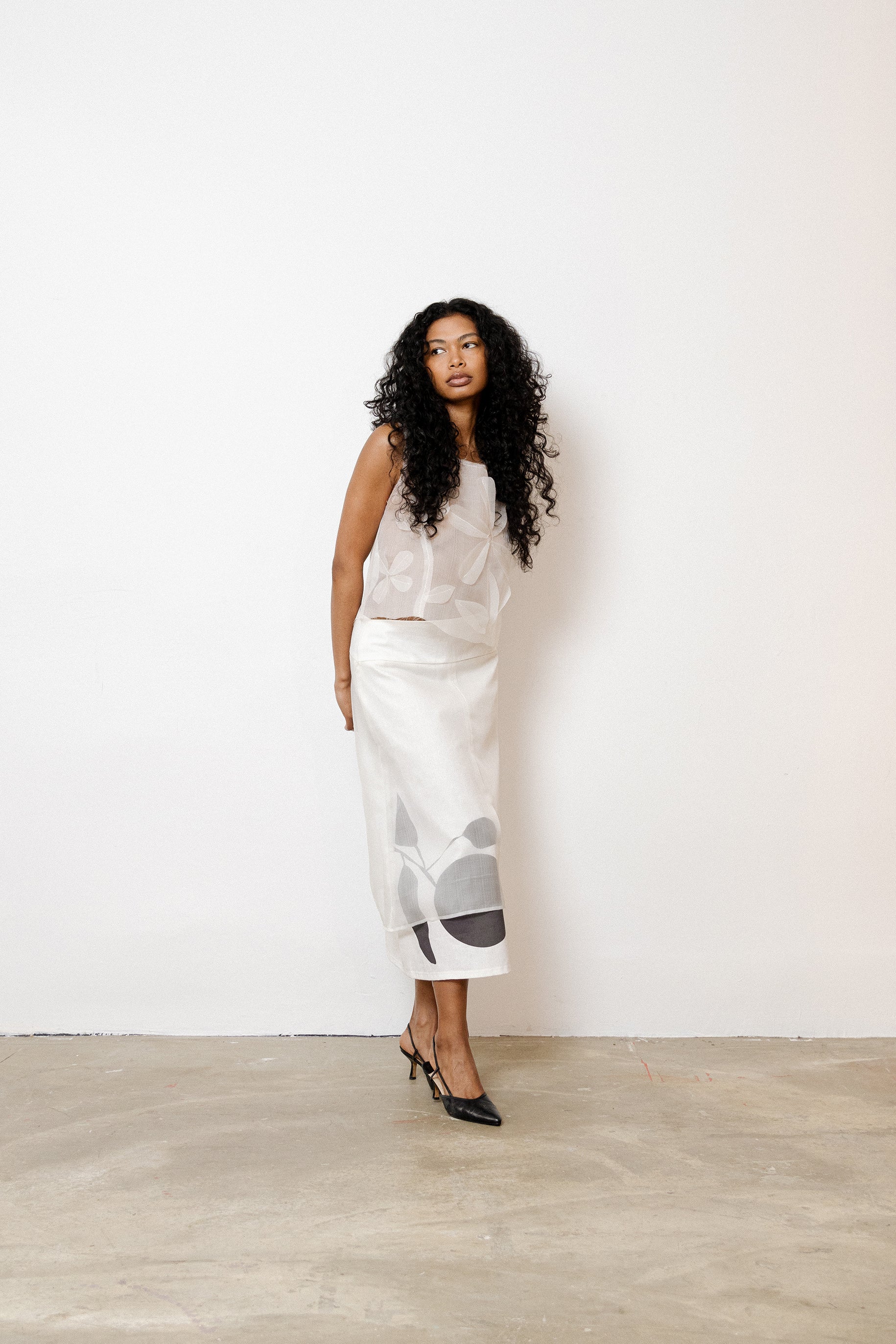 The Floating Petals Top is a silk piece, where delicately hand-cut petals are sewn onto the sheer surface, creating subtle shadows and tactile movement. Made from silk gauze, sourced from the deadstock of an Italian luxury house, this top plays with lightness, layering, and the suggestion of blooming.