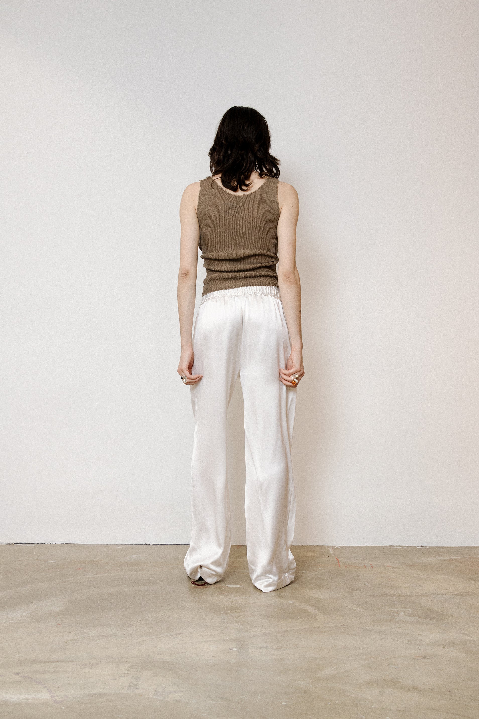Crafted in Paris from a fluid and upcycled white silk crepe satin sourced from a prestigious couture House, the design has a comfortable fit enhanced by the adjustable stretch waistband for a laid-back elegant style. It features signature side pockets inspired by the waves of the House's monogram. The pants can be worn with the coordinated silk shirt, or the lace tank top layered with the tailored jacket for a refined look.