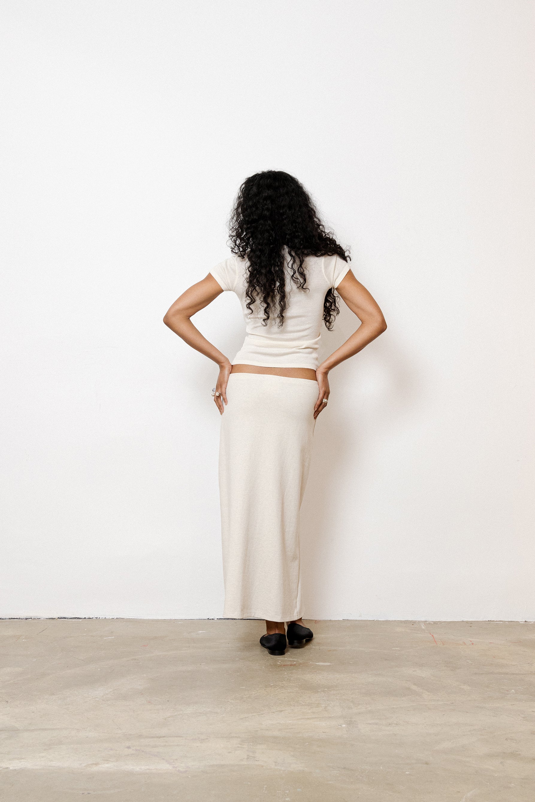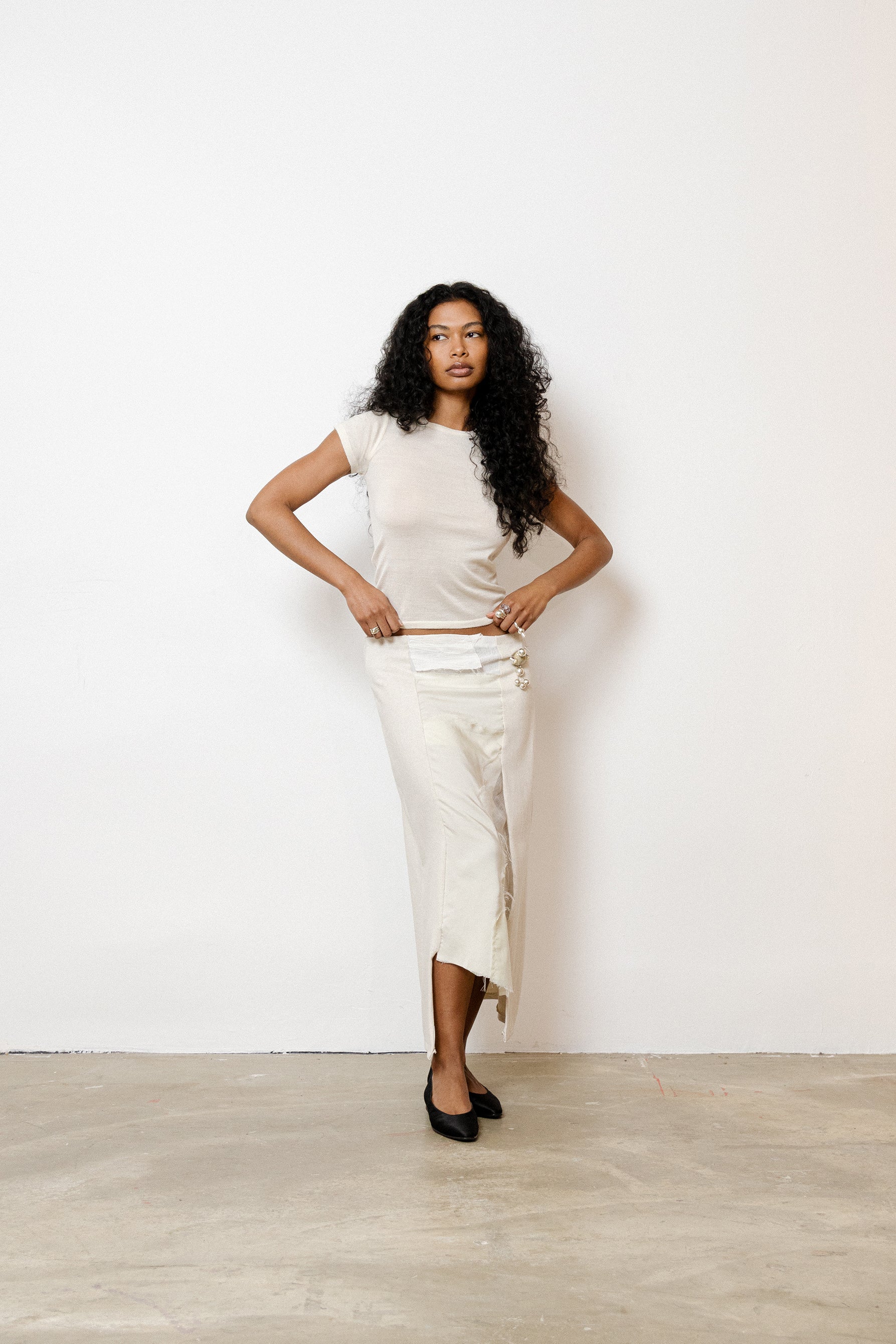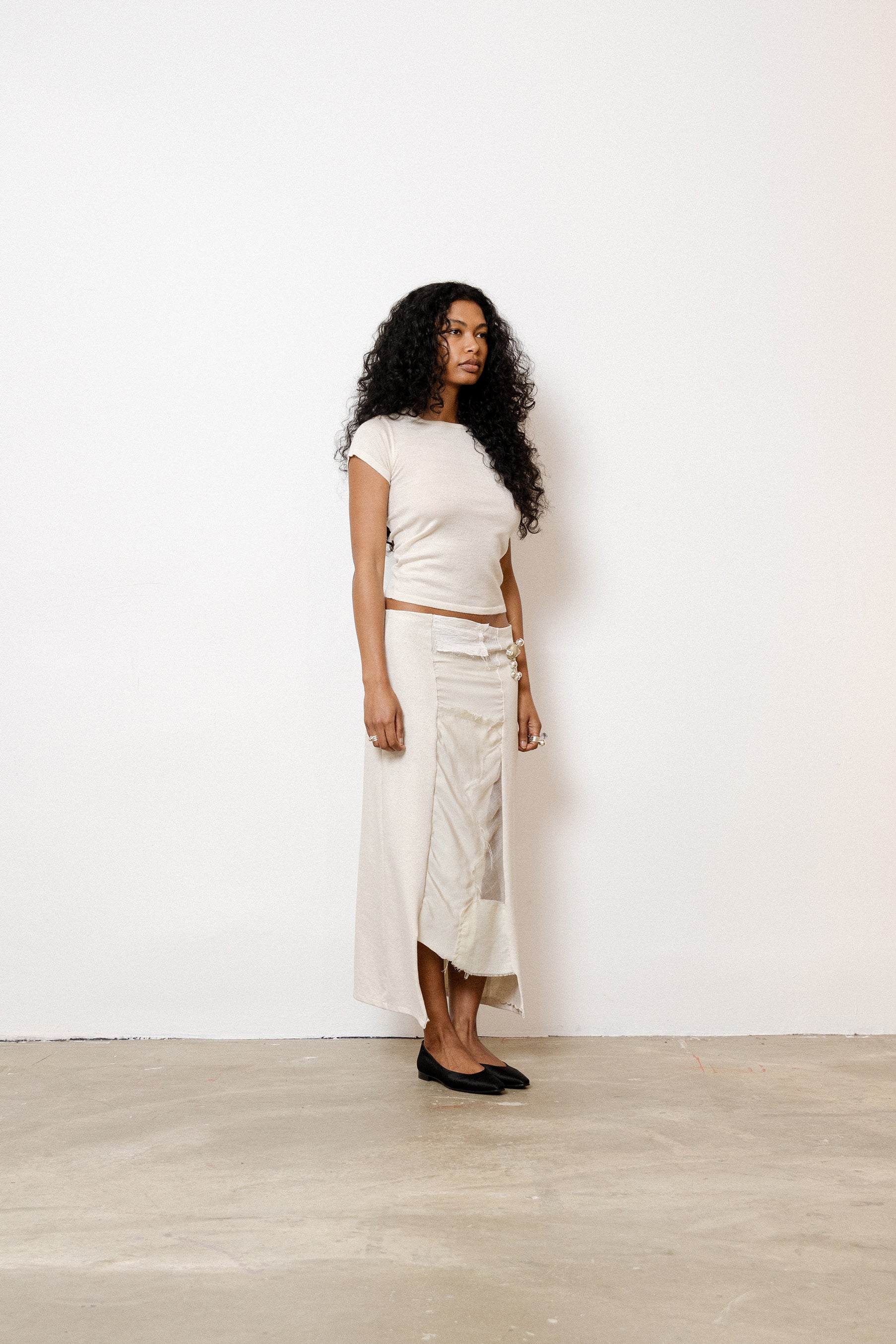 The Patchwork Skirt is a soft jersey piece with a twist, a central panel made from patchworked deadstock fabrics, creating a tactile collage. The body of the skirt is crafted from a fluid, slightly structured jersey sourced from the dormant stock of a French luxury house.