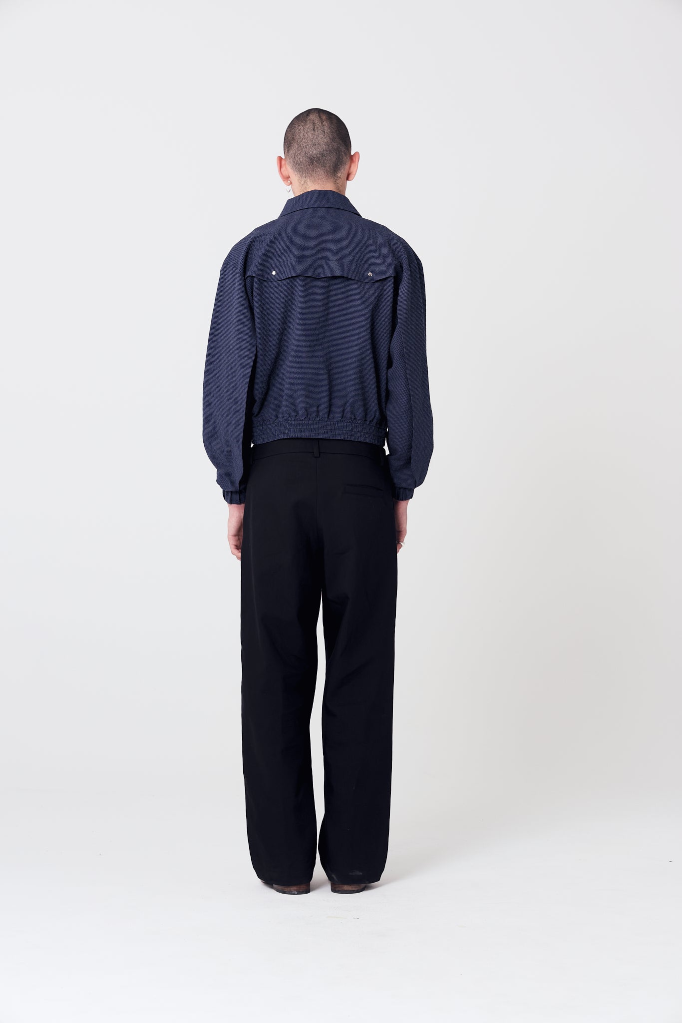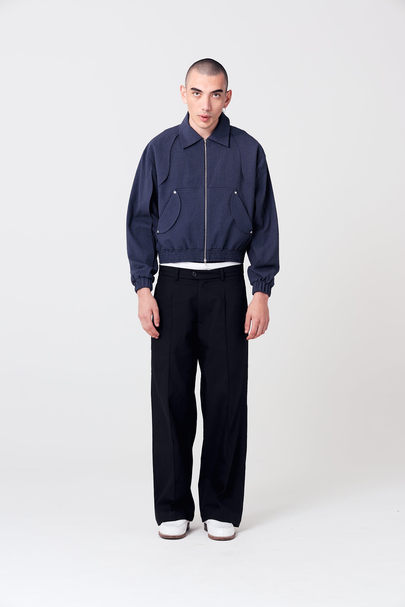 Blue textured fabric bomber jacket with a two-way zippered front closure. Features two petal-shaped flaps and petal pockets.