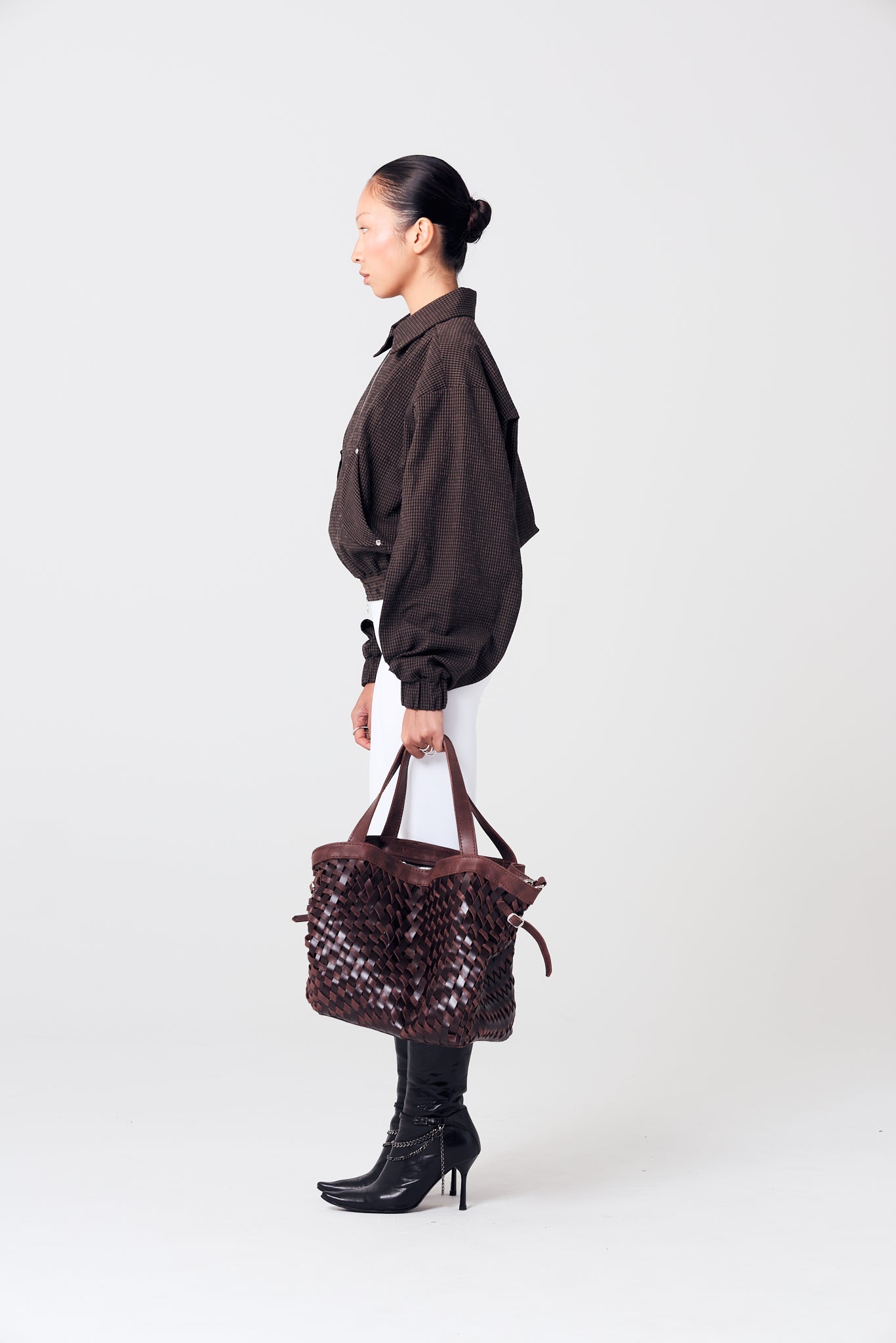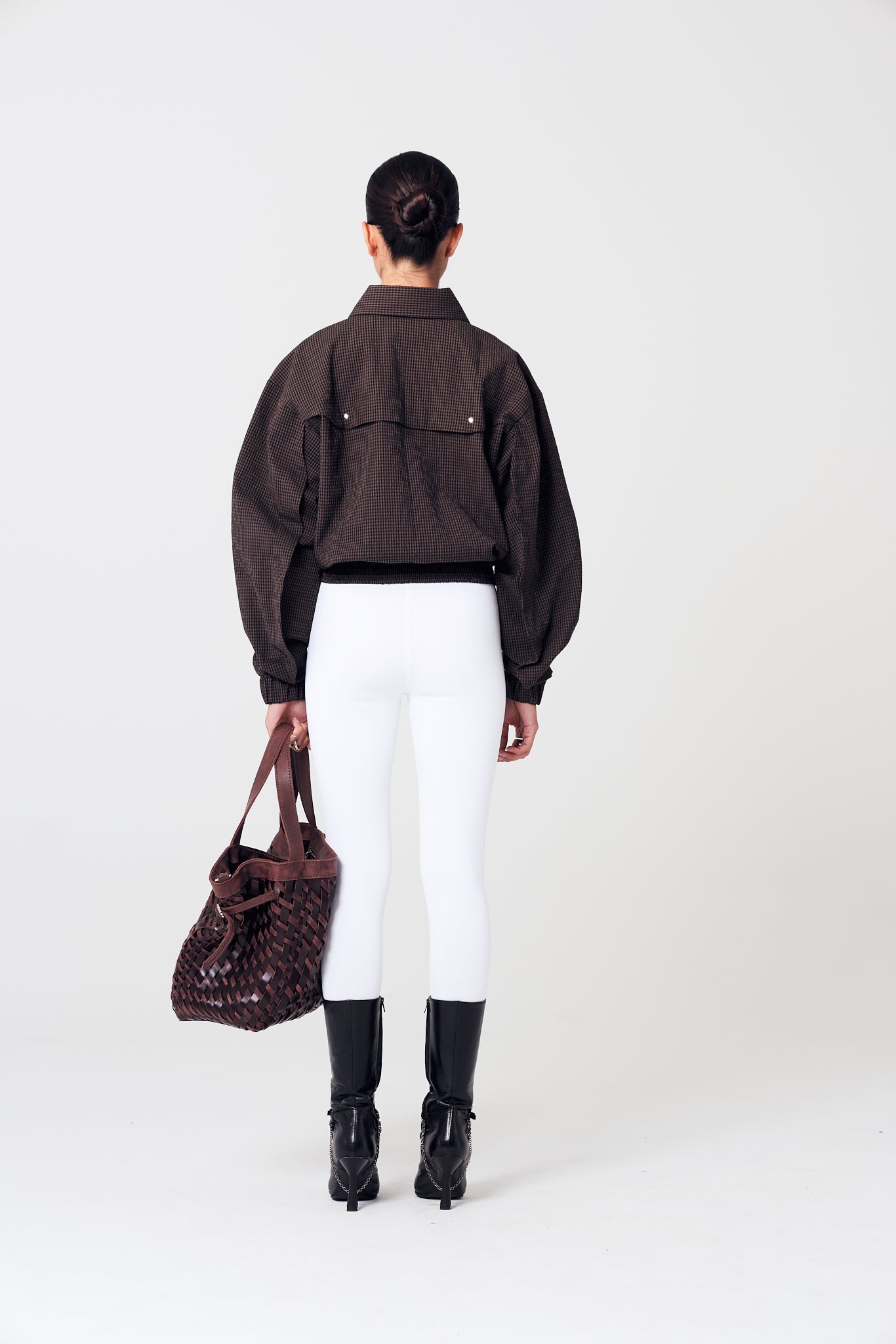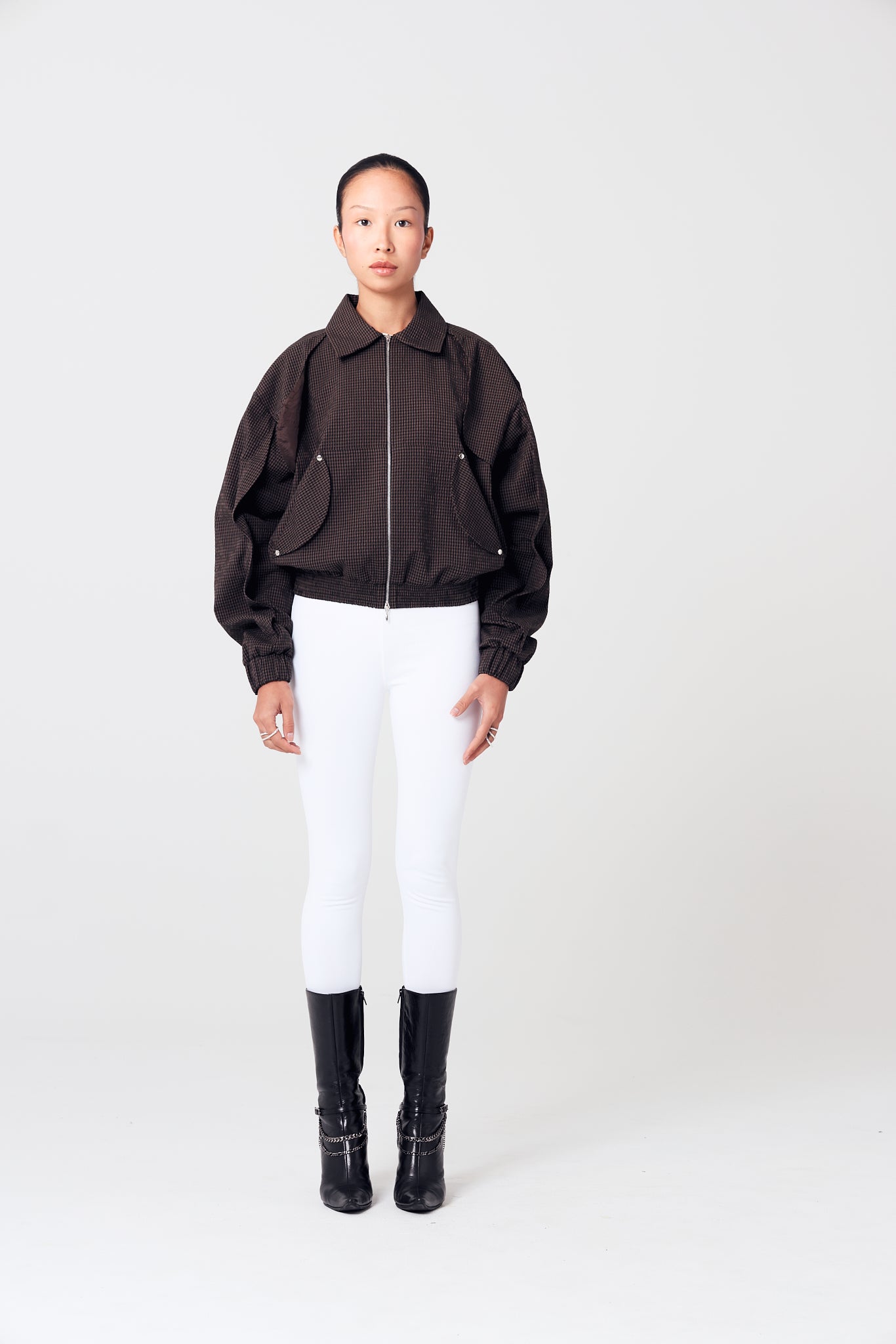 Brown textured fabric bomber jacket with a two-way zippered front closure. Features two petal-shaped flaps and petal pockets.