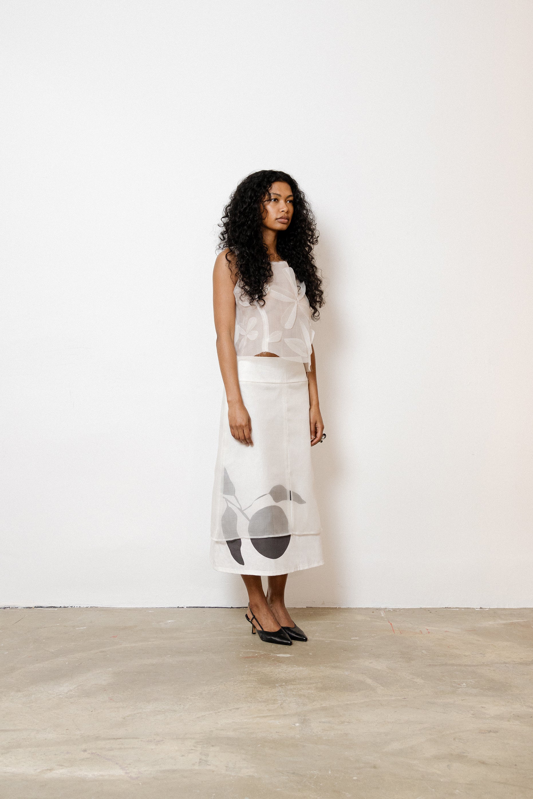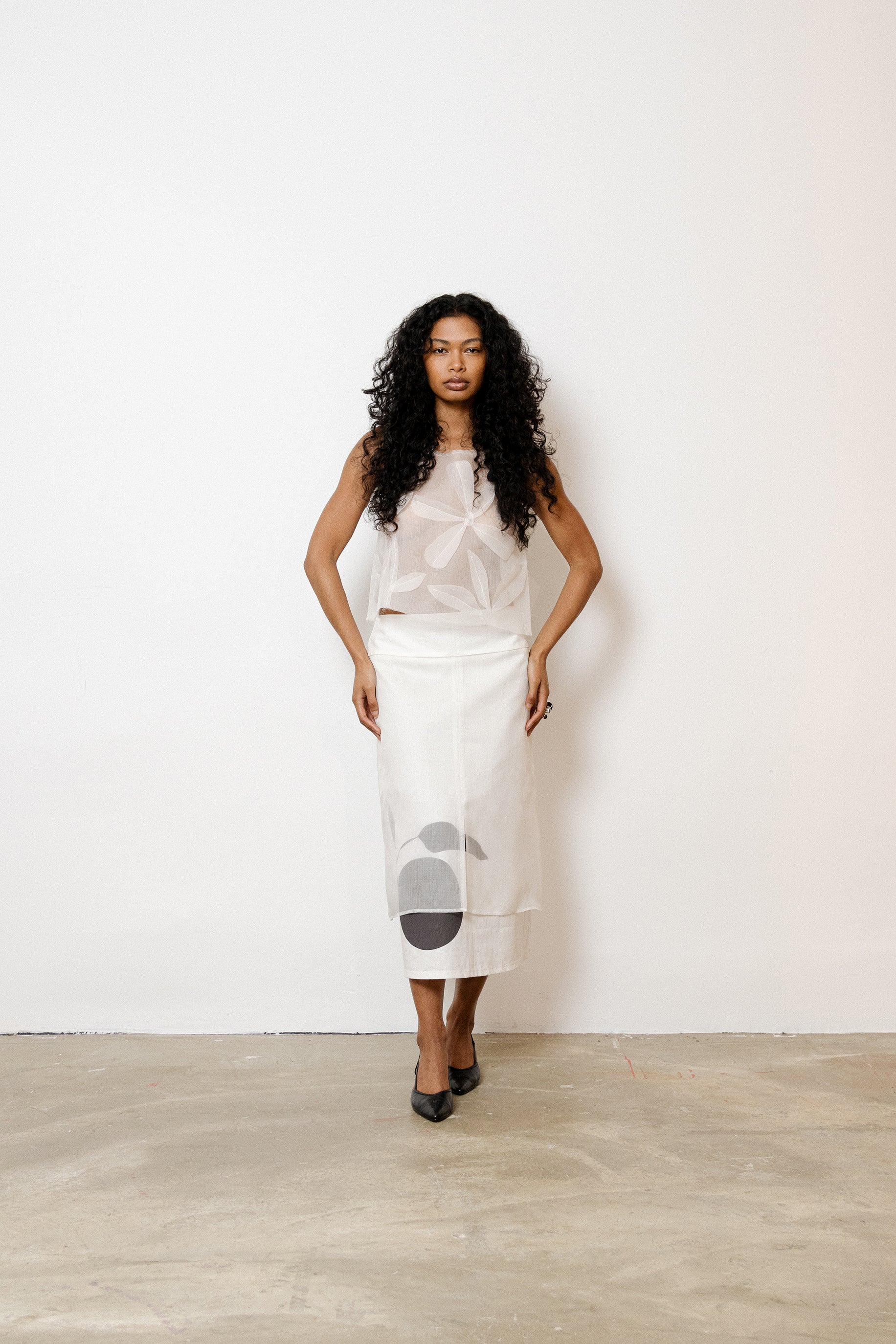 The Shadow Orange Skirt is a delicate composition of natural textures and graphic poetry. Crafted from a mix of brilliant white silk gauze and heavyweight certified linen, this skirt features a hand-drawn, large-scale orange motif printed. Its clean silhouette highlights the contrast between opacity and transparency. Each piece is made in France with certified, upcycled fabrics and eco-conscious inks.