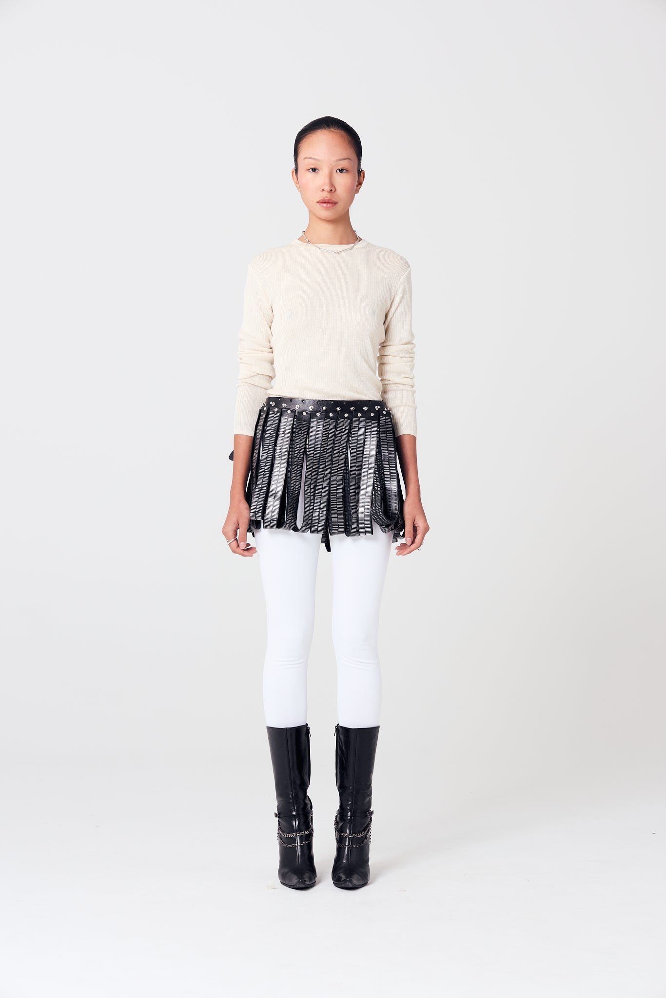 The Staple Skirt is a true statement piece, crafted with meticulous attention to detail. Featuring an adjustable waistband, it effortlessly accommodates different sizes for a perfect fit. Designed with stainless steel staples, this versatile skirt also offers an adjustable length feature, allowing you to transform your look between two lengths.